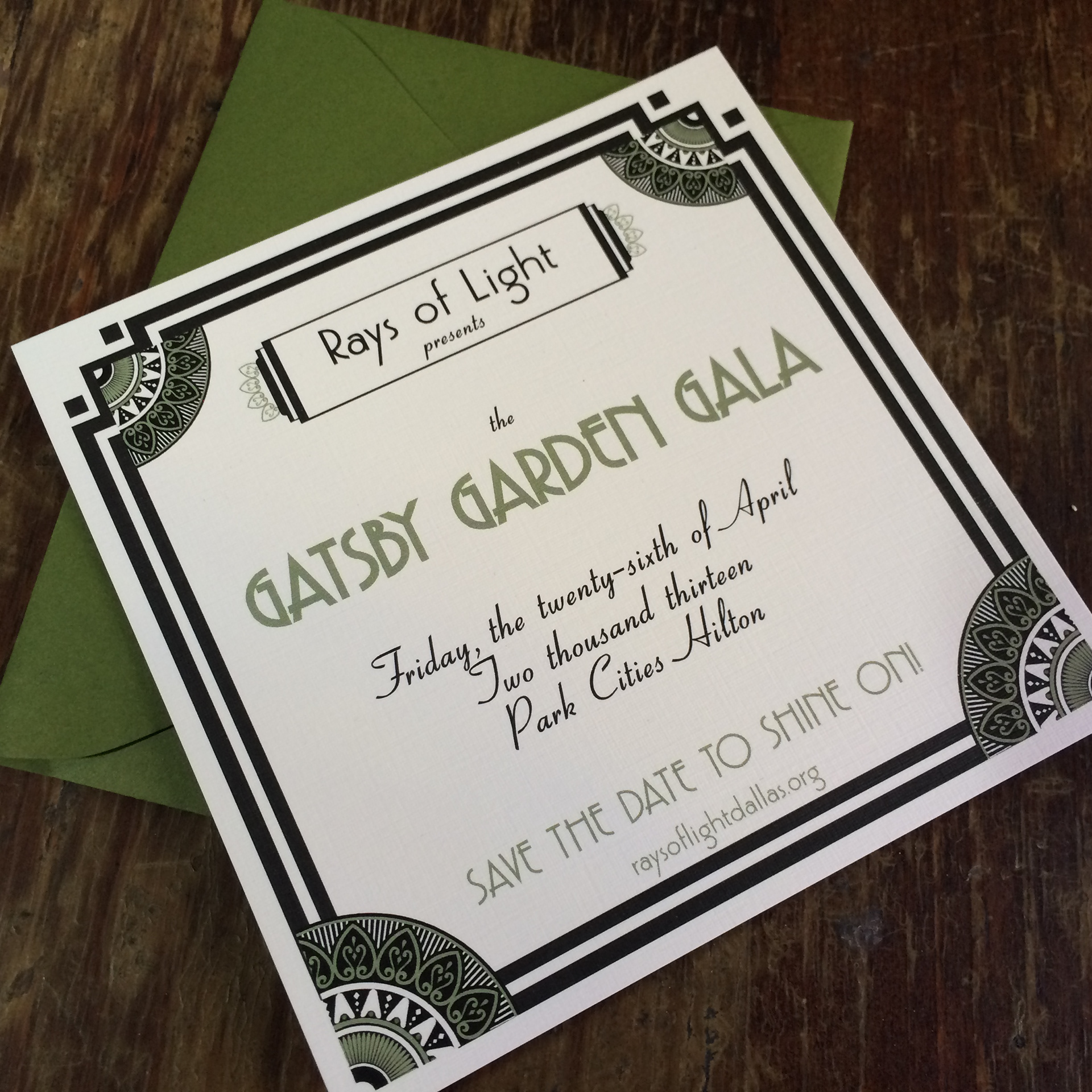 Gatsby-themed invitation for fundraiser for Rays of Light, a nonprofit serving children with special needs and their families